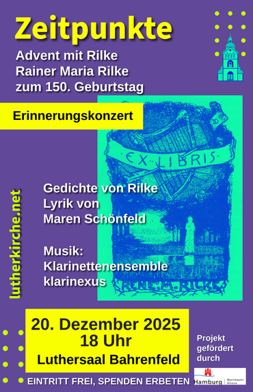 In der Reihe "Zeitpunkte" erinnern wir an den 150. Geburtstag des Dichters Rainer Maria Rilke am 4. Dezember. Es wird eine Auswahl seiner Texte rund um den Advent vorgetragen, ergänzt durch von ihm inspirierte Gedichte aus der Feder der mehrfach ausgezeichneten Lyrikerin Maren Schönfeld aus Ottensen.