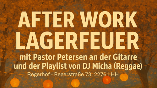 After Work Lagerfeuer auf dem Regerhof - Donnerstag 9.10. 2025 18.00 - 21.00 Pastor Nils Petersen an der Gitarre - Reggae von DJ Micha - Open Kleiderkammer - Getränke aus dem Hofladen - Wurst (auch Veggie) im Brötchen